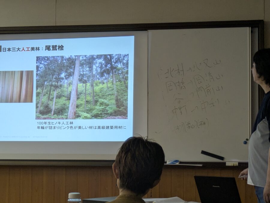 そこから、世界の森林事情、森林・林業基本法における林野庁の意義、森林の多面的機能、林業の市場規模などなど、まずは森林林業の全体概要を解説したうえで、三大美林をはじめとした日本のさまざまな林業を、私たちが携わってきた事例とともにご紹介しました。