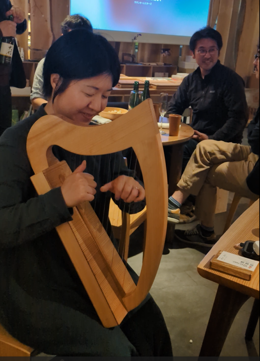 店内の木材を納材した方や産地の方からのエピソード紹介、また国産材ハープの演奏もあり、何とも贅沢なひとときでした。