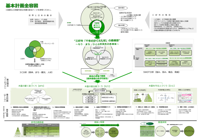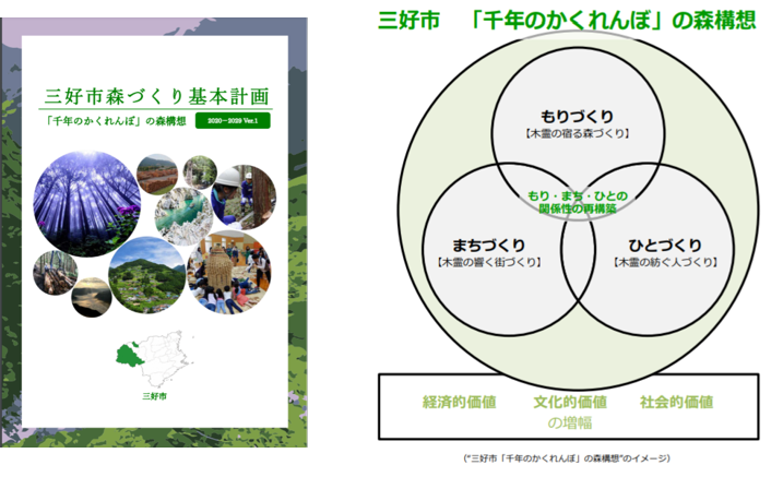 森林の恵みや森の働きを再認識するとともに、森林の有する多面的機能の持続的な発揮を重視した新たな森づくりの展開を図るため、森林・林業に関わる人々の役割を明確にしながら、森づくりに関する施策やその取り組みを総合的かつ計画的に実施するため、条例に沿った「三好市森づくり基本計画」を策定しました。なお、木霊の宿る森づくり、木霊の響く街づくり、木霊の紡ぐ人づくりという森・街・人の3視点を入れ、さらに既存の「千年のかくれんぼ」という観光圏のコンセプトを掛け合わせることで独自性を出しました。